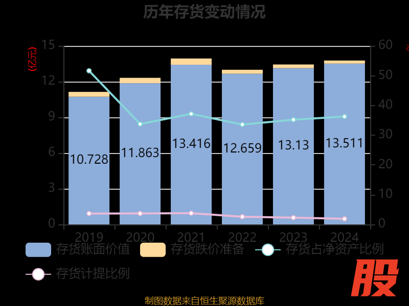 从存货变动来看证星策略,截至2024年末,公司存货账面价值为13.51亿元,占净资产的36.26%,较上年末增加3809.73万元。其中,存货跌价准备为2593.8万元,计提比例为1.88%。