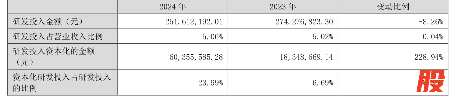 2024年全年,公司研发投入金额为2.52亿元,同比下降8.26%;研发投入占营业收入比例为5.06%,相比上年同期上升0.04个百分点。此外,公司全年研发投入资本化率为23.99%。