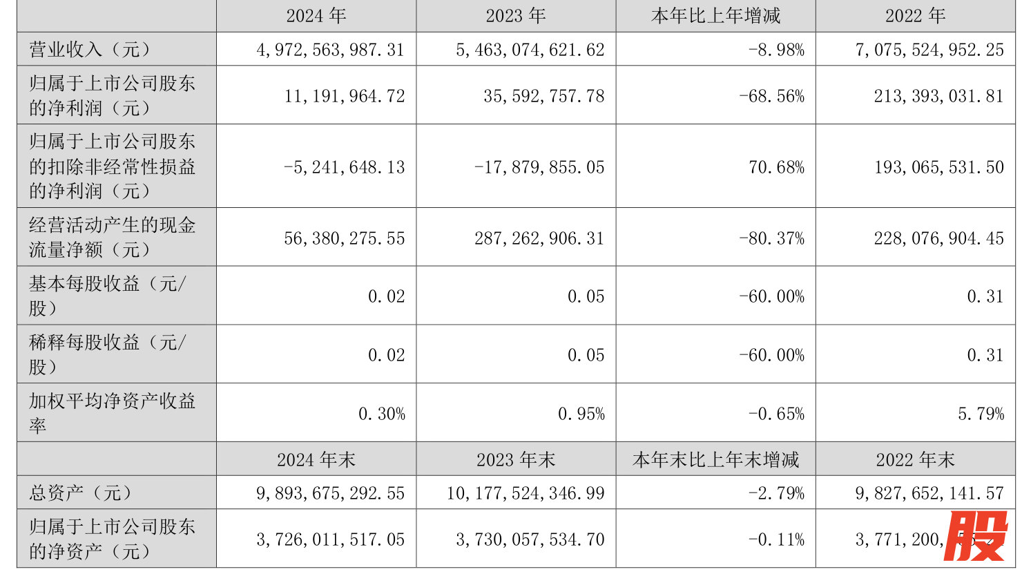 数据显示,2024年公司加权平均净资产收益率为0.3%,较上年同期下降0.65个百分点。公司2024年投入资本回报率为0.01%,较上年同期下降0.5个百分点。